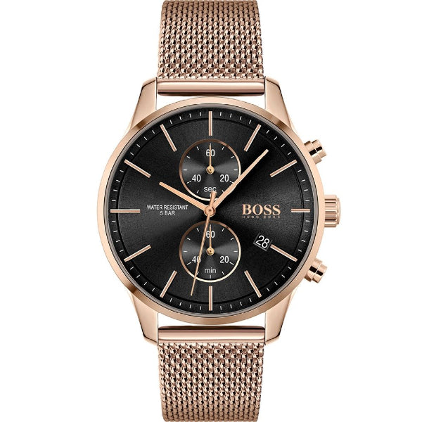 HUGO BOSS Associate Rose Gold Mesh Bracelet Black Dial Chronograph Quartz Men Watch HUGO BOSS 1513806 - 100% Authentic with Official Warranty & Free Shipping Across Pakistan.