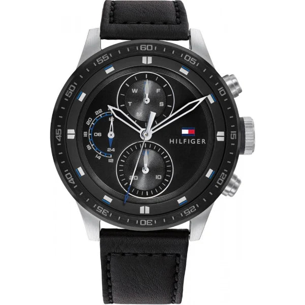 Tommy Hilfiger Trent Black Leather Strap Black Dial Chronograph Quartz Men Watch 1791810 - 100% Authentic with Official Warranty & Free Shipping Across Pakistan.