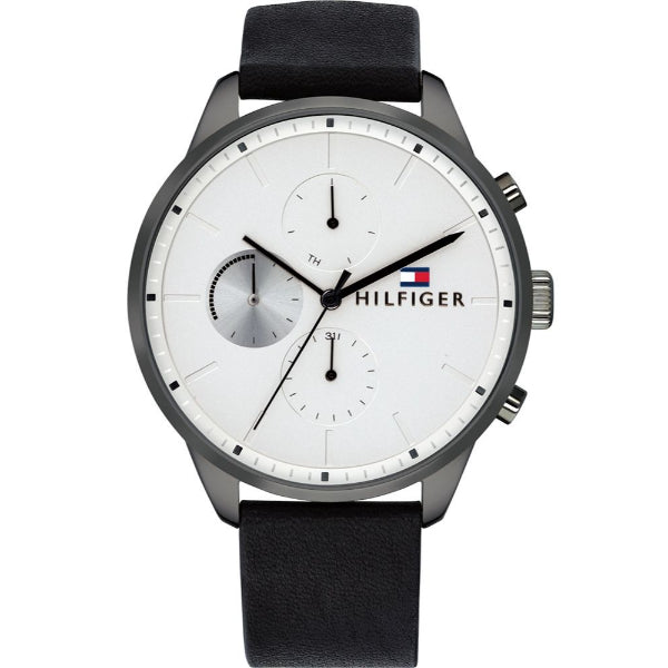 Tommy Hilfiger Chase Black Leather Strap White Dial Chronograph Quartz Watch for Men - 1791489