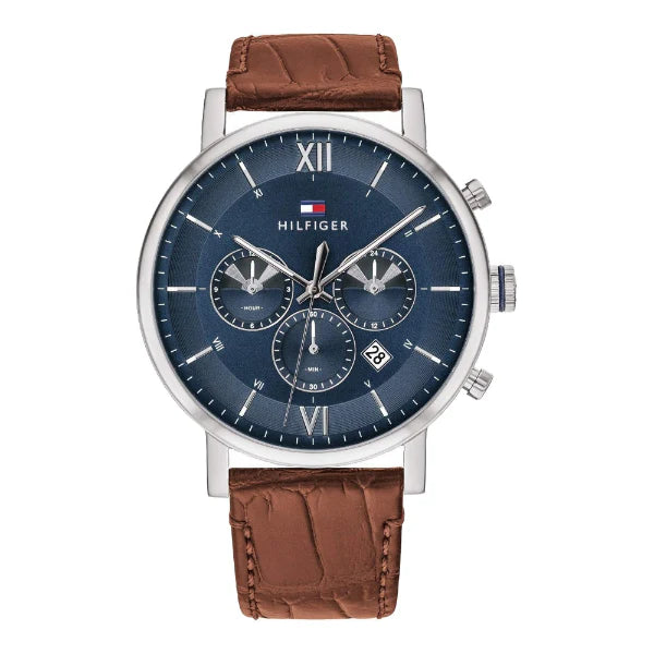Tommy Hilfiger Evan Brown Leather Strap Blue Dial Chronograph Quartz Watch for Men - 1710393