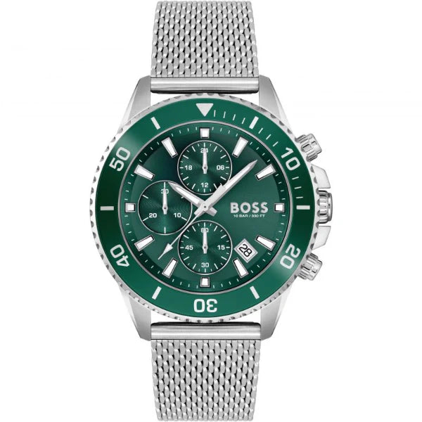 HUGO BOSS Admiral Silver Mesh Bracelet Green Dial Chronograph Quartz Men Watch 1513905 - 100% Authentic with Official Warranty & Free Shipping Across Pakistan.