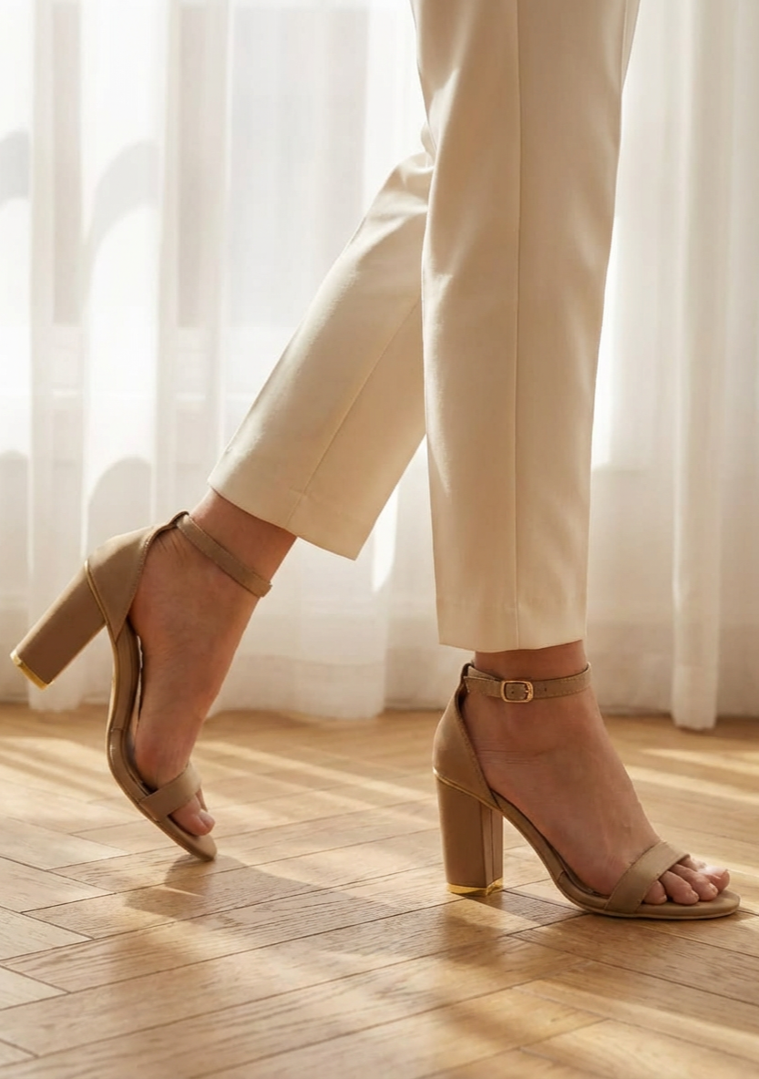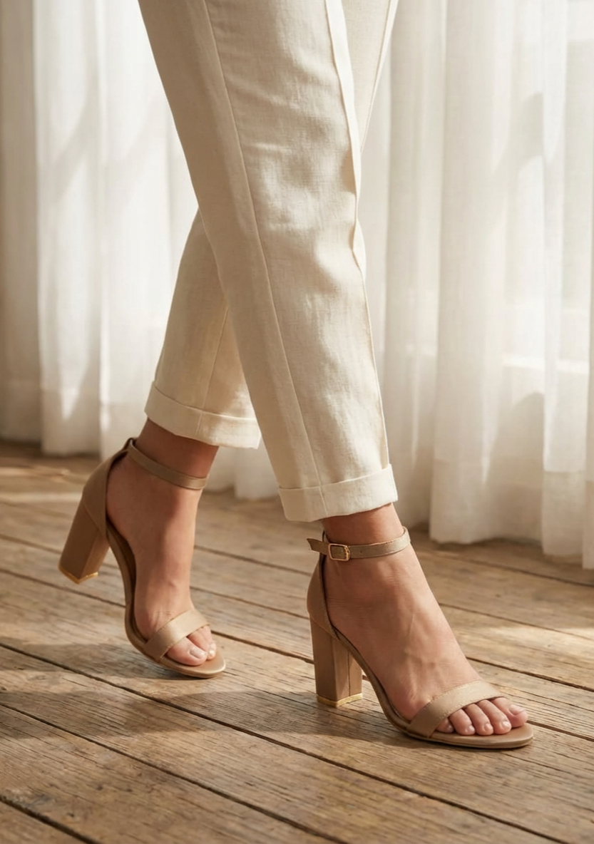 Ariana in Soft Beige highlights the minimal architecture of the design with a clean, neutral finish. The subtle tone complements the sculpted heel and ankle strap, delivering a polished, contemporary elegance that feels light, refined, and endlessly wearable.