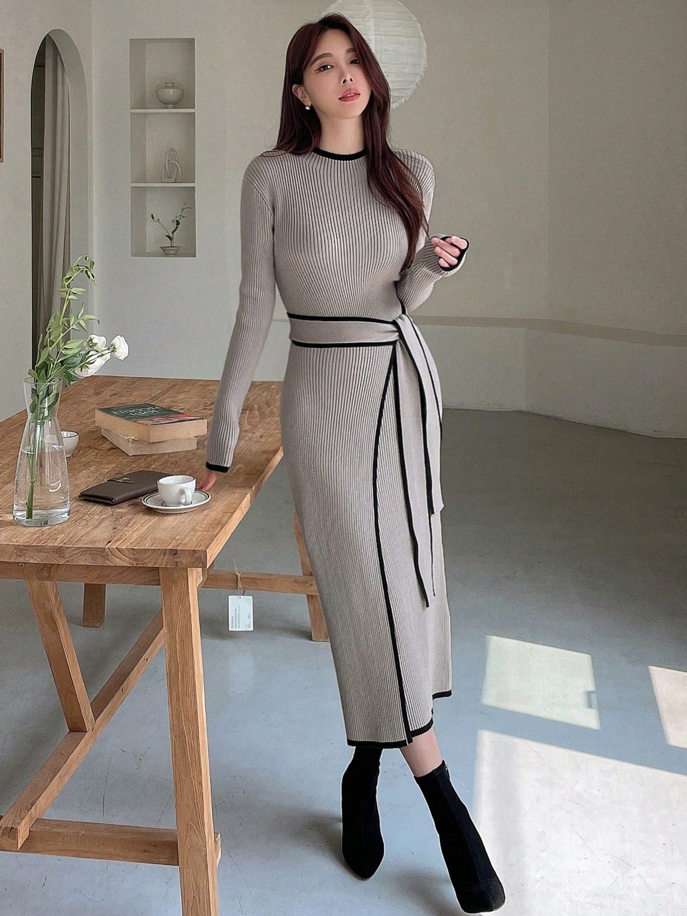 SHEIN DAZY Contrast Binding Belted Sweater Dress